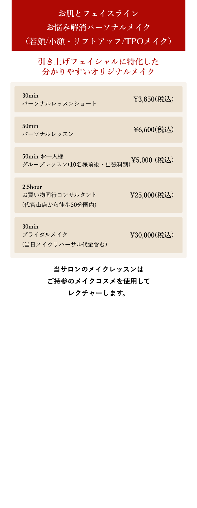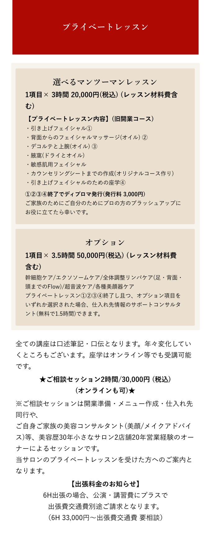 元美容部員26歳で独立、有名事務所にてブライダルメイク・エステに従事し、大手化粧品メーカー・大手企業の美容教育に携わる。VIP向けのカウンセリングゲストや技術者として国内外のイベントやセミナーに参加し2万人以上の女性に触れる。自身のサロン(神戸・代官山)では、台湾で出会った養生食・漢方・漢方茶と引き上げのリフティングフェイシャル&リンパケア・チネイザンを組み合わせた独自のケアを提供する。